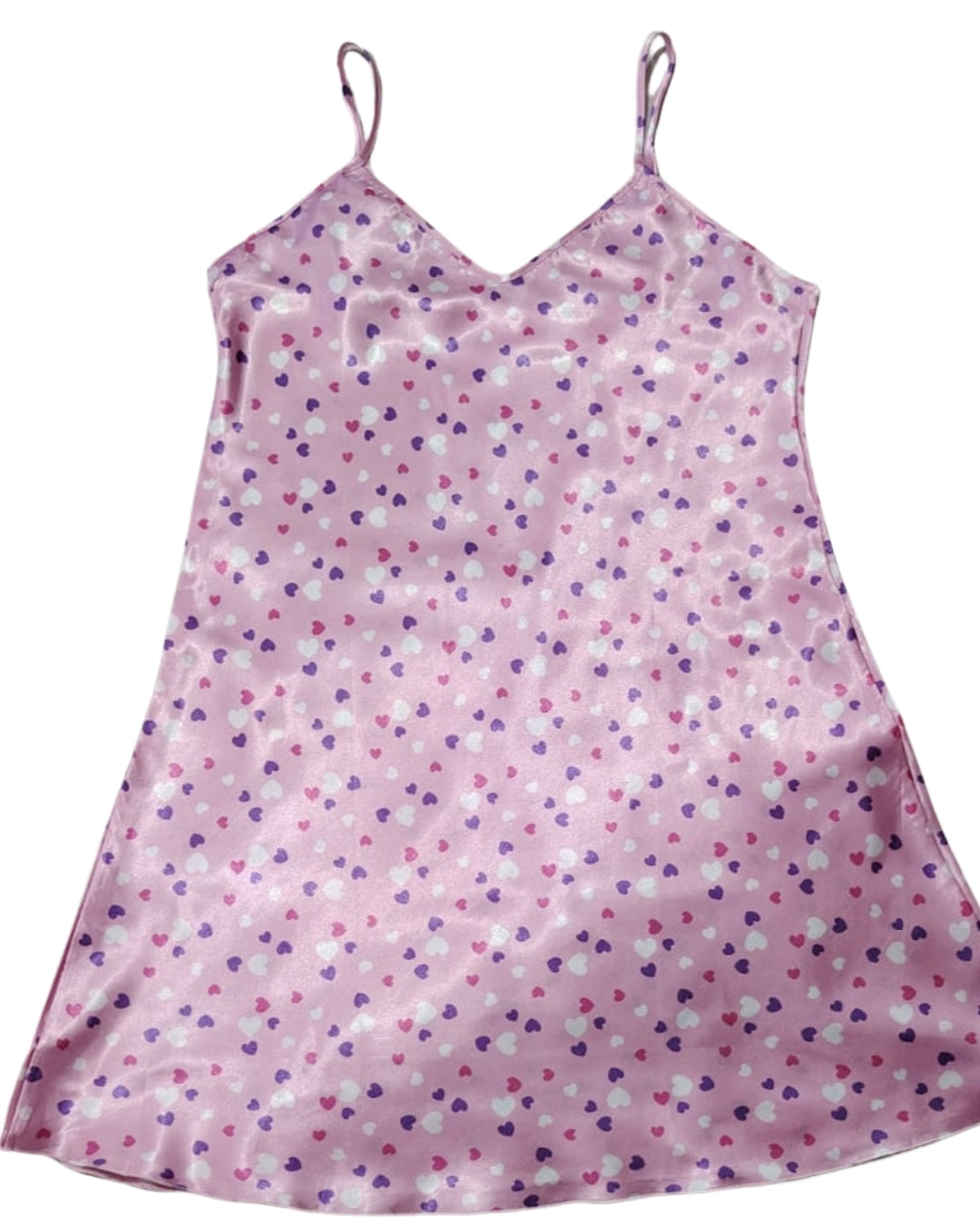 Este pijama de satín en tono rosado está diseñado con un delicado estampado de corazones en 🩷💜🤍, que le da un look tierno y femenino. Su tela suave y ligera se adapta al cuerpo brindando frescura y una caída elegante.